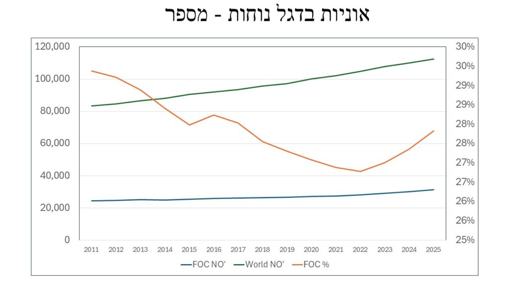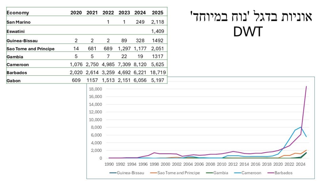 בדיקת הנתונים בשנתיים האחרונות מעלה תופעה של עלייה דרמטית ברישום אוניות במדינות דגל 'נוח במיוחד' בהן יש רגולציה מינימלית. ברבדוס, למשל, נרשם זינוק של יותר מפי 4 במשקל כולל של האוניות הרשומות במדינה בין 2023-2025, מ-4,692 ל-18,719 טון. גם מדינות קטנות כמו סאן מרינו וגינאה-ביסאו יש קפיצה מדהימה ברישום אוניות.