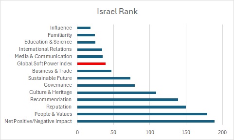 ארגון Brand Finance מפרסם מדי שנה את מדד הכוח הרך של מדינות. העולם מעריך את ישראל בשנת 2025 כמדינה האחרונה בעולם מבחינת תרומתה לקהילה הבין לאומית!